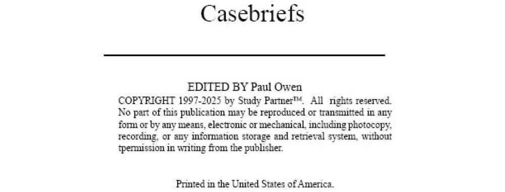 We brief all the cases portrayed in the book and not the Notes cases. Study Partner has the best written case briefs. They consistently give you superior information about the case so if you are called on in class you will be just fine. There are four advantages to using our Study Partner Case Brief Books. They come GBC punched with covers that have no titles. They not only lie flat but you can easily take them to class as they have no commercial markings on the cover of any kind. Each case brief gives you the: NATURE OF THE CASE: FACTS: ISSUE: RULE OF LAW: HOLDING AND DECISION: LEGAL ANALYSIS: