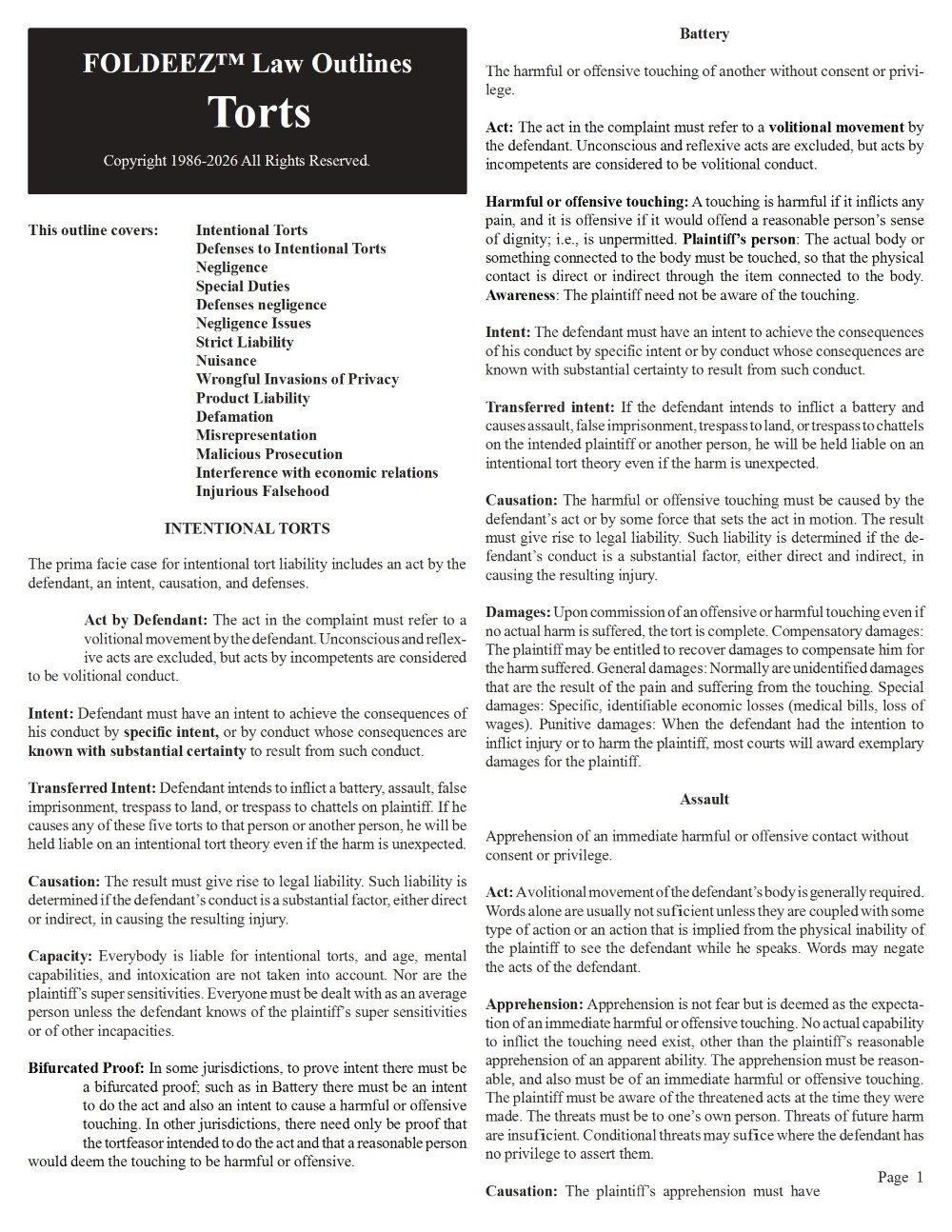 A Special Offer: TORTS FOLDEEZ LAW OUTLINE AT 1/2 PRICE