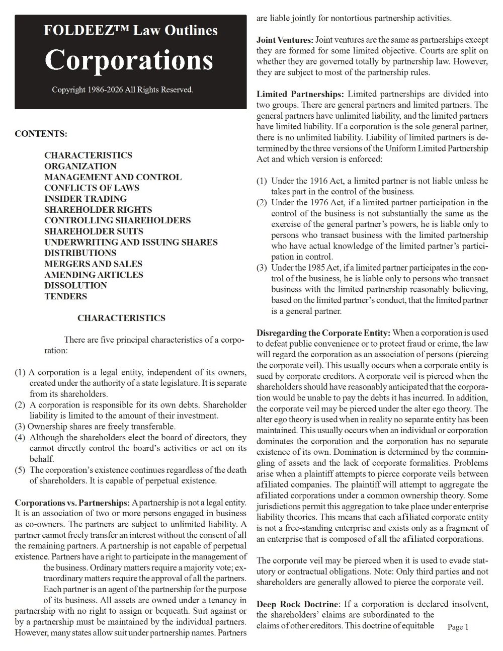 Topics: Characteristics / Organization /Management and Control / Conflicts of Law Shareholder Rights / Controlling Shareholders/ Insider Trading / Shareholder Suits / Amending Articles / Under Writing and Issuing Shares / Distributions Mergers and Sales / Dissolutions / Tenders.