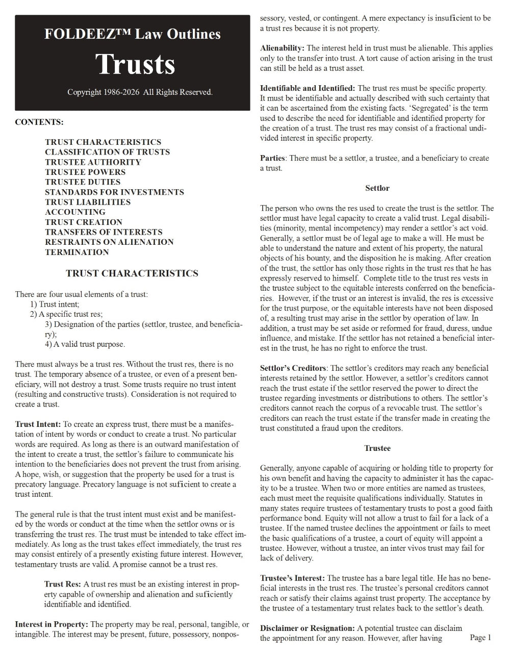 Trusts Topics: Trust Characteristics / Classification of Trusts / Trustee Authority / Powers / Duties / Standards for Investment / Trust Liabilities / Accounting / Trust Creation / Transfers of Interest / Termination / Restraints on Alienation.