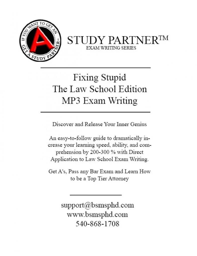 This is a 4.5 hour lecture covering all the aspects of taking exams in law school for the topics of Tort, Contracts, and Criminal Law. This lecture will teach you all the skills you need to get A’s on all your law school exams. The lecture includes a 4.5 hour MP3 file set you can download online and then have, the Foldeez™ Law Outlines for Torts, Contracts, and Criminal Law and the Study Partner Exam Writing I book shipped to you.