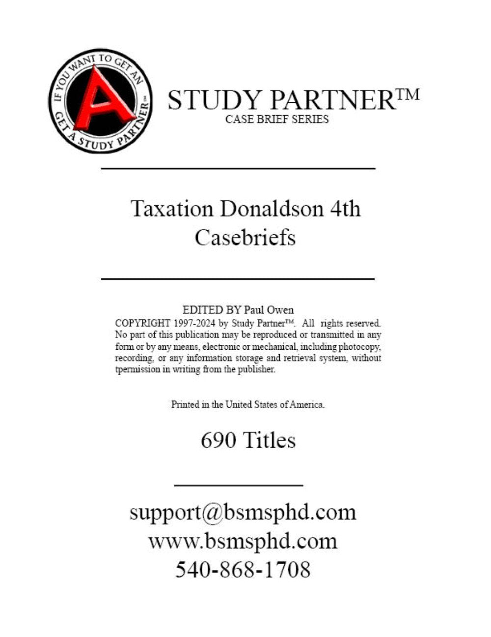 We brief all the cases portrayed in the book and not the Notes cases. Study Partner has the best written case briefs. They consistently give you superior information about the case so if you are called on in class you will be just fine. There are four advantages to using our Study Partner Case Brief Books. They come GBC punched with covers that have no titles. They not only lie flat but you can easily take them to class as they have no commercial markings on the cover of any kind. Each case brief gives you the: NATURE OF THE CASE: FACTS: ISSUE: RULE OF LAW: HOLDING AND DECISION: LEGAL ANALYSIS: